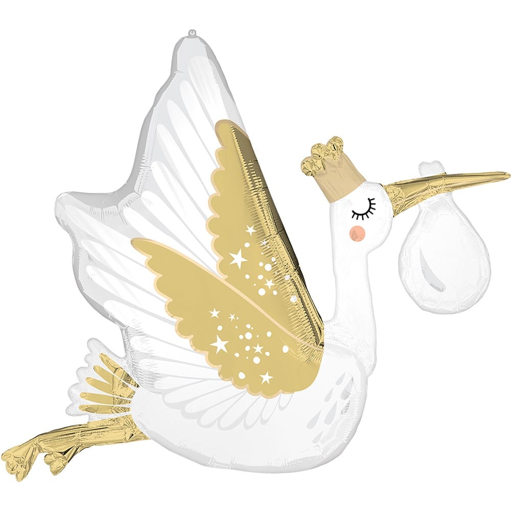 Υπέροχο μπαλόνι Supershape σε σχέδιο χρυσού πελαργού, ιδανικό για baby shower ή για να υποδεχθείς με χαρά το νέο μέλος της οικογένειας.
