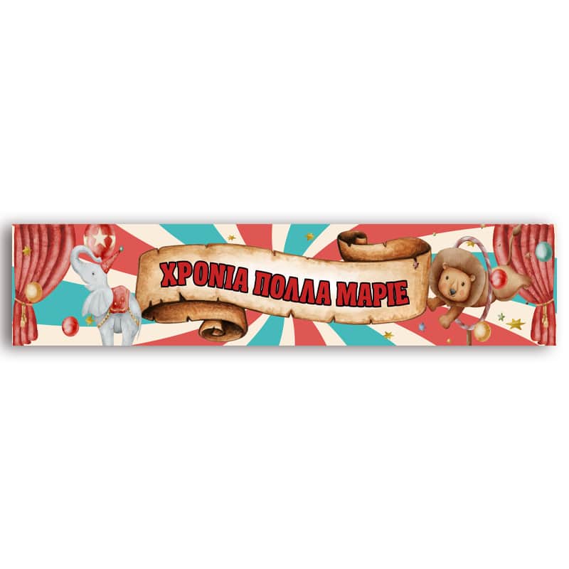 Banner πάρτυ Τσίρκο και τυπωμένο το όνομα της επιλογής σας! Μπορεί να χρησιμοποιηθεί ως runner για τη διακόσμηση του τραπεζιού ή ως banner στην πόρτα ή τον τοίχο.