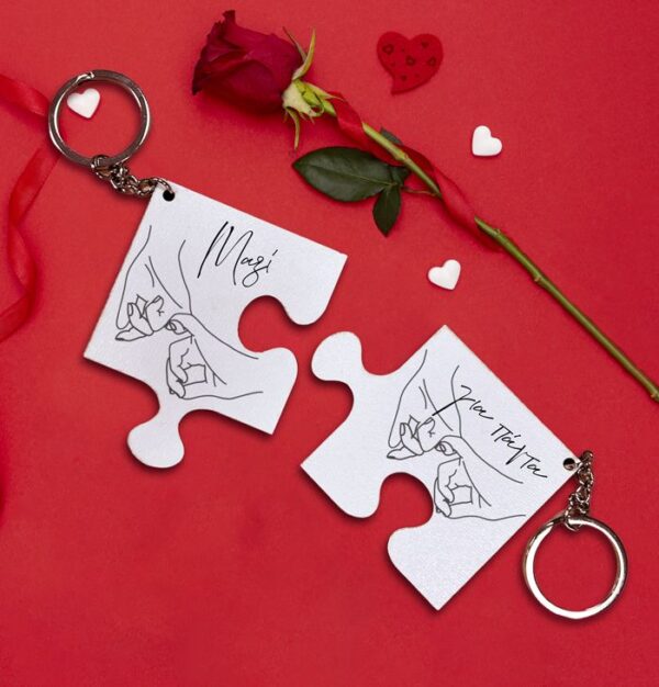 Σετ ξύλινα μπρελόκ για τα κλειδιά σε σχήμα παζλ με ενωμένα χέρια. Ένα έξυπνο δωράκι για ζευγάρια!