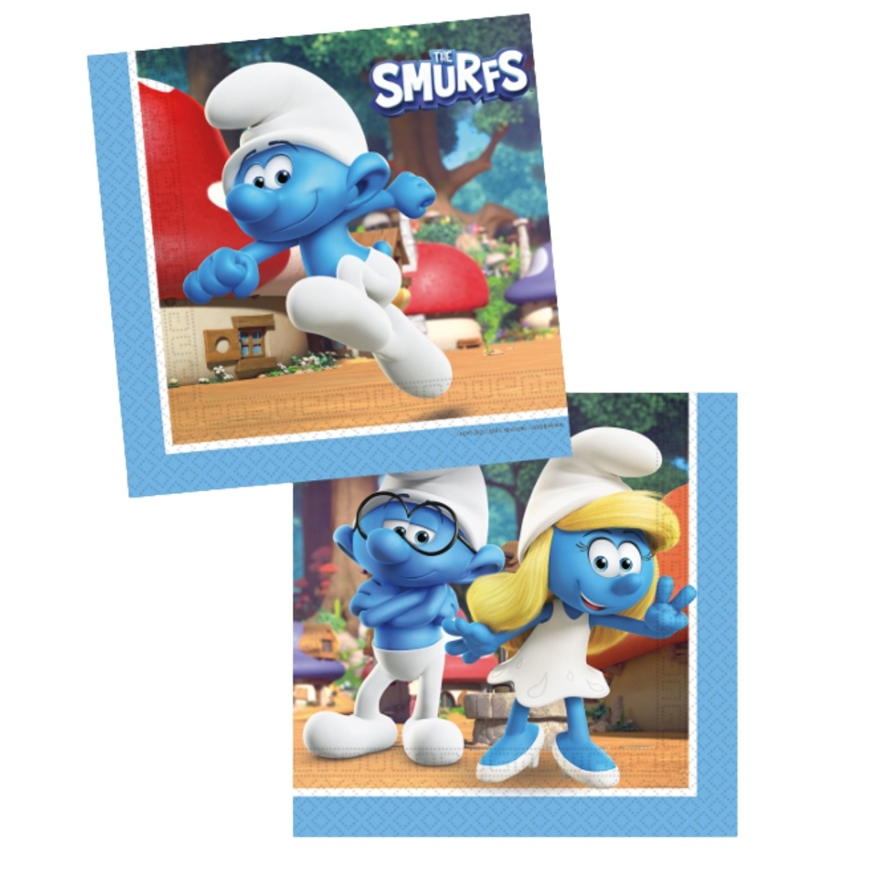 Σετ χάρτινες χαρτοπετσέτες με χαριτωμένα σχέδια από το αγαπημένο καρτούν Στρουμφάκια. Ιδανικές για παιδικά πάρτι, φέρνουν τη μαγεία και τη χρωματιστή διάθεση των μικρών μπλε ηρώων στο τραπέζι.