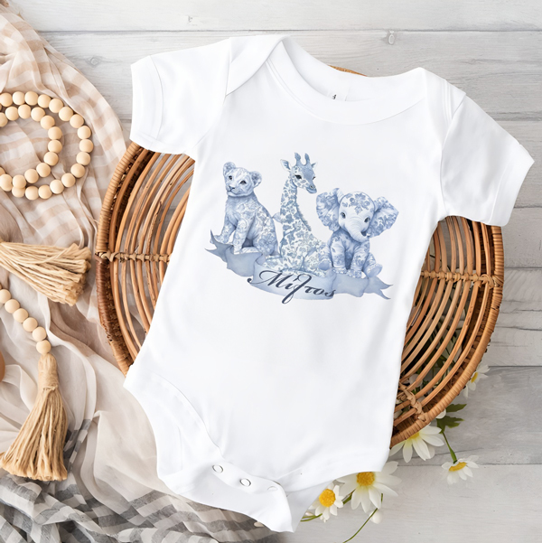 Φορμάκι για να φορά το μωράκι σας με εκτυπωμένο το όνομα και θέμα Blue Toile Ζώα Της Ζούγκλας!