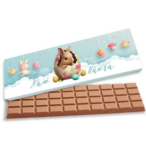 Γίγας σοκολάτα σε χάρτινη κασετίνα με λαγουδάκι και μήνυμα “Καλό Πάσχα”. Χαρίστε τη στα αγαπημένα σας πρόσωπα και ευχηθείτε Καλό Πάσχα με το πιο γλυκό τρόπο!