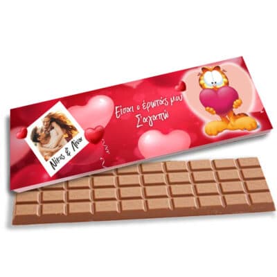 Γίγας σοκολάτα σε χάρτινη κασετίνα με τη φωτογραφία σας, τα ονόματά σας και τον γατούλη Garfield, για να γλυκάνετε το ταίρι σας την ημέρα του Αγίου Βαλεντίνου!