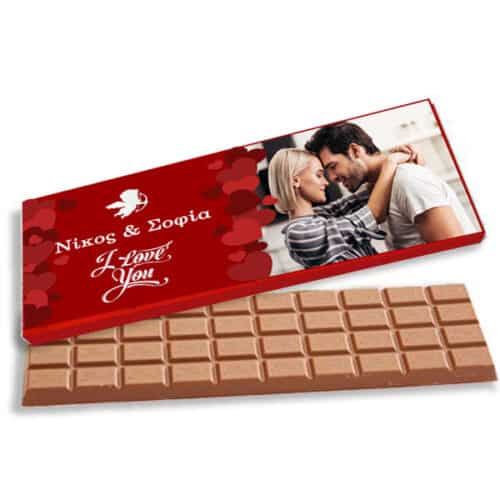 Κάντε το πιο γλυκό δώρο στο ταίρι σας για τη γιορτή του Αγίου Βαλεντίνου! Γίγας σοκολάτα σε χάρτινη κασετίνα με εκτυπωμένη τη φωτογραφία και τα ονόματά σας και μήνυμα “I Love you”!