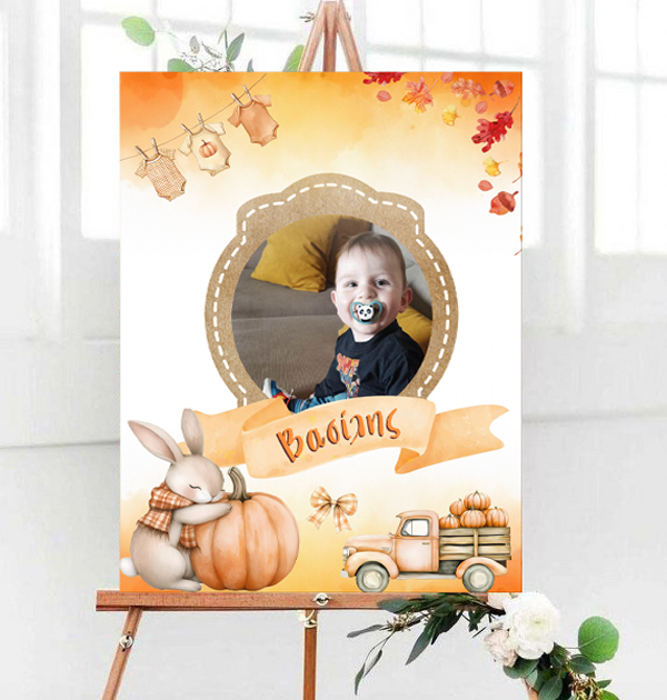Διακοσμήστε το χώρο της βάπτισης και υποδεχθείτε τους καλεσμένους σας, με καμβά σε θέμα Κολοκύθα με Λαγουδάκι και εκτυπωμένη τη φωτογραφία του μωρού σας!