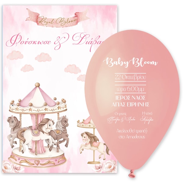 Πρωτότυπο προσκλητήριο βάπτισης σε τυπωμένο μπαλόνι με θέμα Ροζ Καρουζέλ. Οι καλεσμένοι θα πρέπει να φουσκώσουν το τυπωμένο μπαλόνι για να μάθουν τις λεπτομέρειες της βάπτισης!